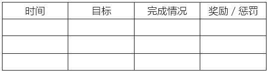 第四,你需要给自己树立明确的“奖惩机制”。很多英语学习者其实在漫长的学习过程中最大的障碍是“坚持不下去”“学了这么长时间一点进步也没有”,因此,你需要有个这样的表格: