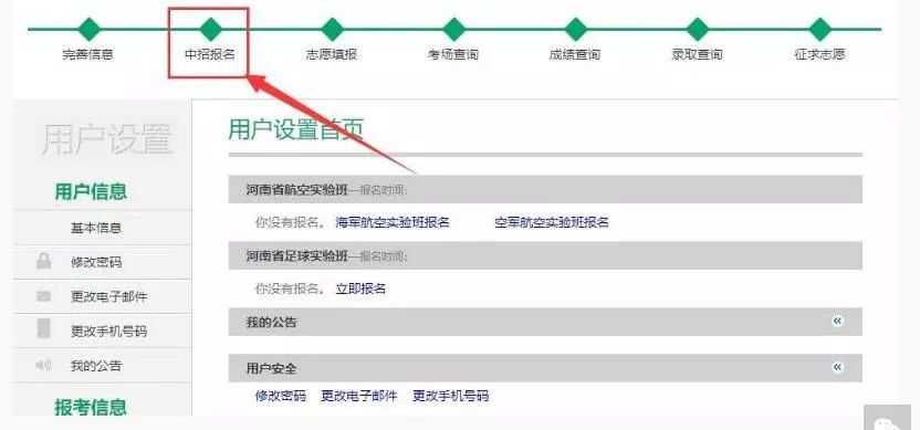 成功登录后进入“用户设置”页面,点击上方“中招报名”进入编填报页面,下图: