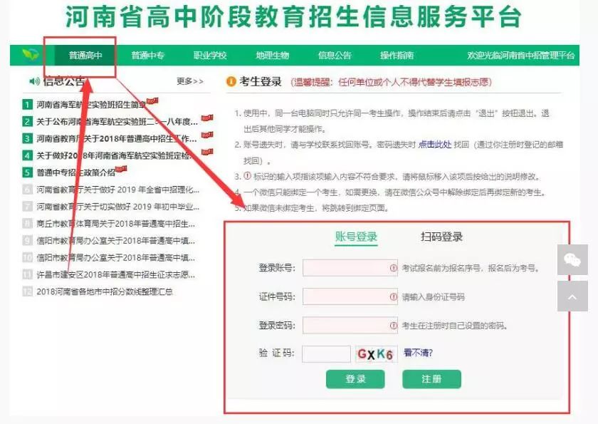 在导航中点击“普通高中”,进入考生登录界面。登录分“账号登录”和“扫码登录 ”方式,如下图