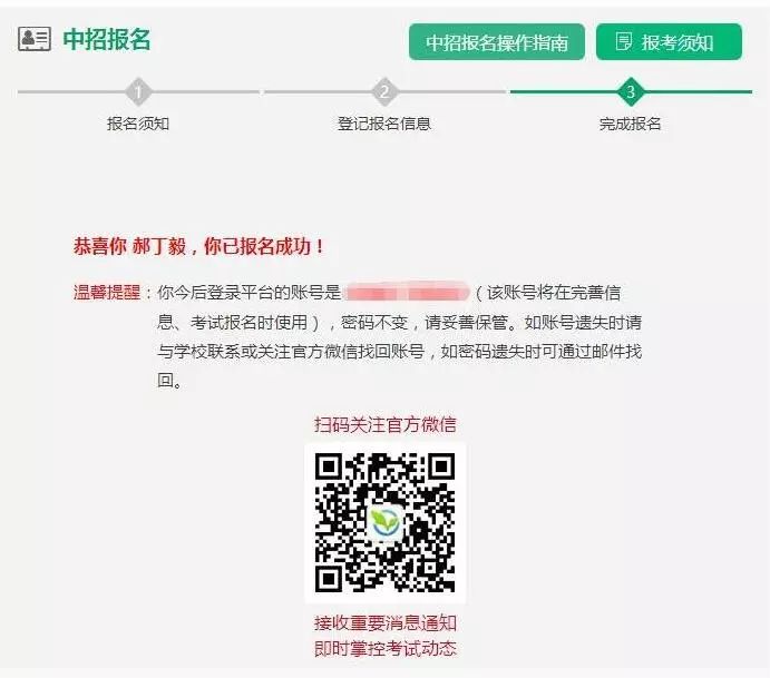 从此时起,考生登录系统的“登录账号”将变成为考生的“中招考号”,“登录密码”不变(即考生在注册过程中自己设置的密码),请考生妥善保管。如账号遗失请及时与学校联系,如密码遗失可以通过邮件找回。
