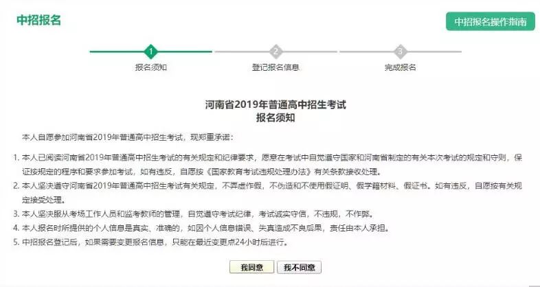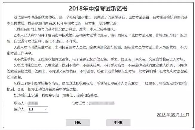 请考生认真阅读承诺书,如接受承诺书条款,点击“我同意”进入下一步。否则点击“我不同意”放弃本次中考报名。