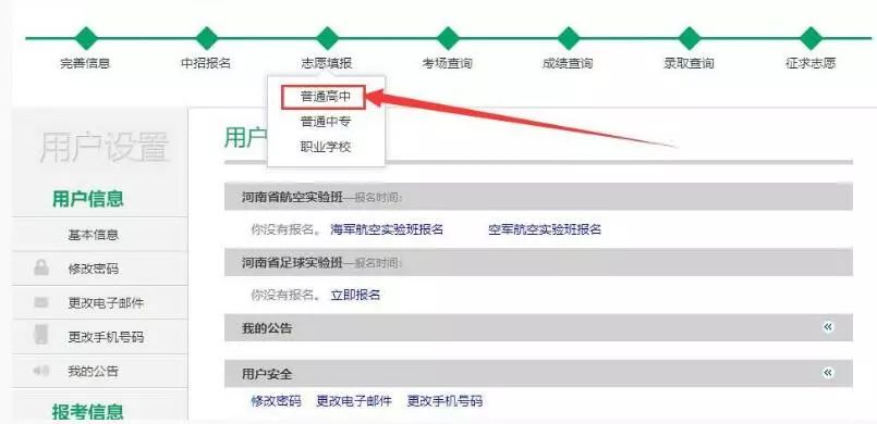 成功登录后进入“用户设置”页面,点击上方“志愿填报-->普通高中”进入填报页面,如下图: