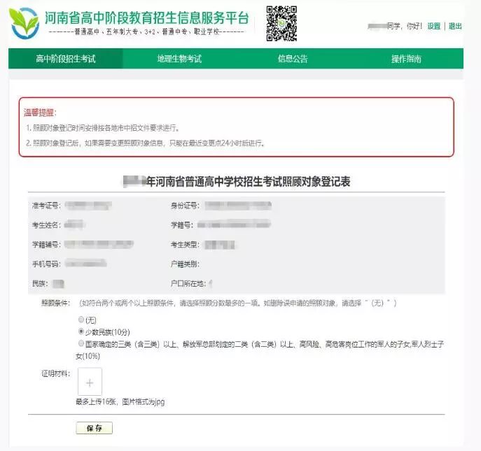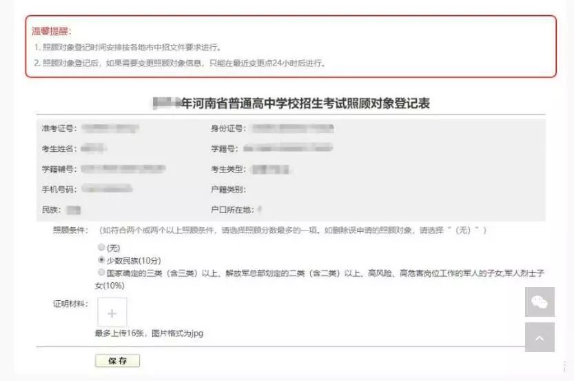 1.符合照顾加分条件的考生要如实选择照顾类型,如若不具备照顾加分条件的考生请选择“无”;