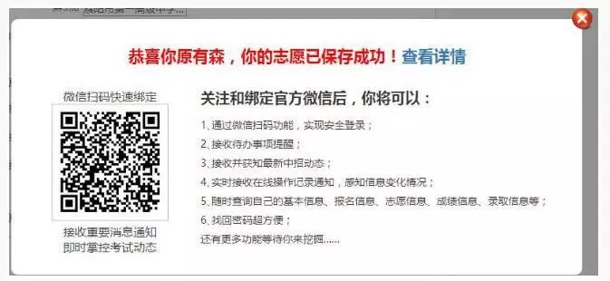 志愿信息填写完善保存成功后,点击“查看详情”即可进入考生志愿信息查看界面,如下图: