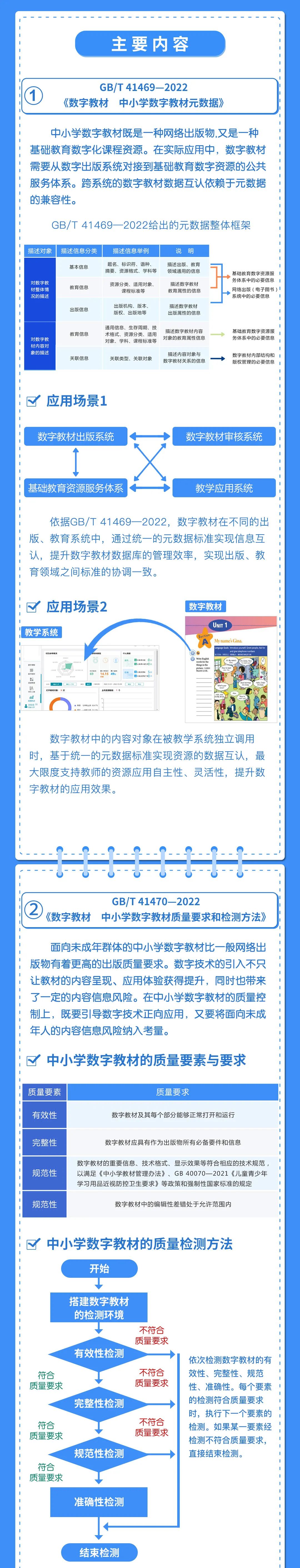 国家标准包括《数字教材 中小学数字教材出版基本流程》《数字教材 中小学数字教材元数据》《数字教材 中小学数字教材质量要求和检测方法》。