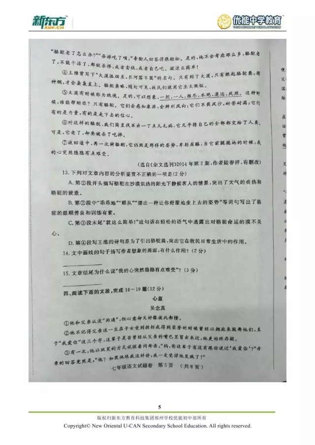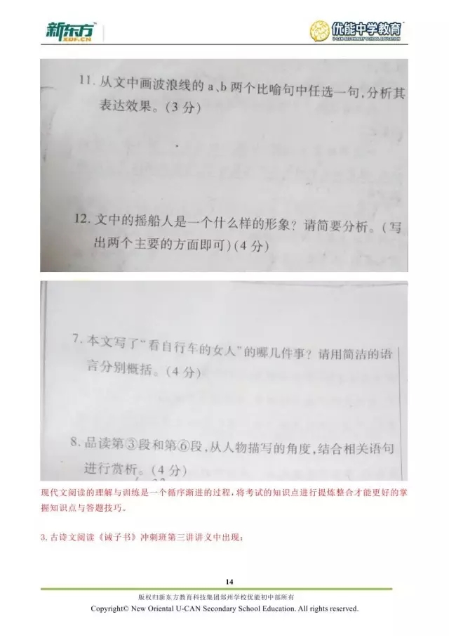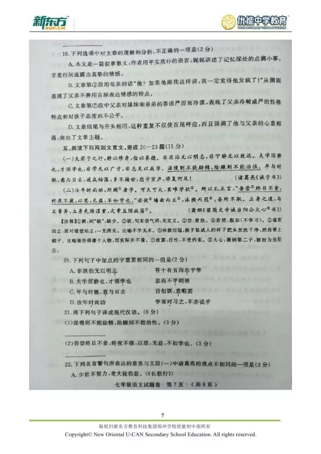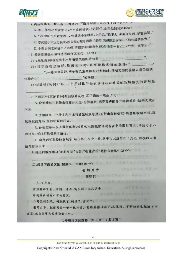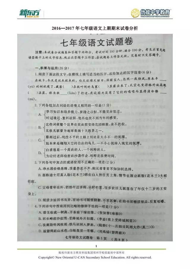 2017郑州七年级语文期末试卷解析来袭【郑州新东方】
