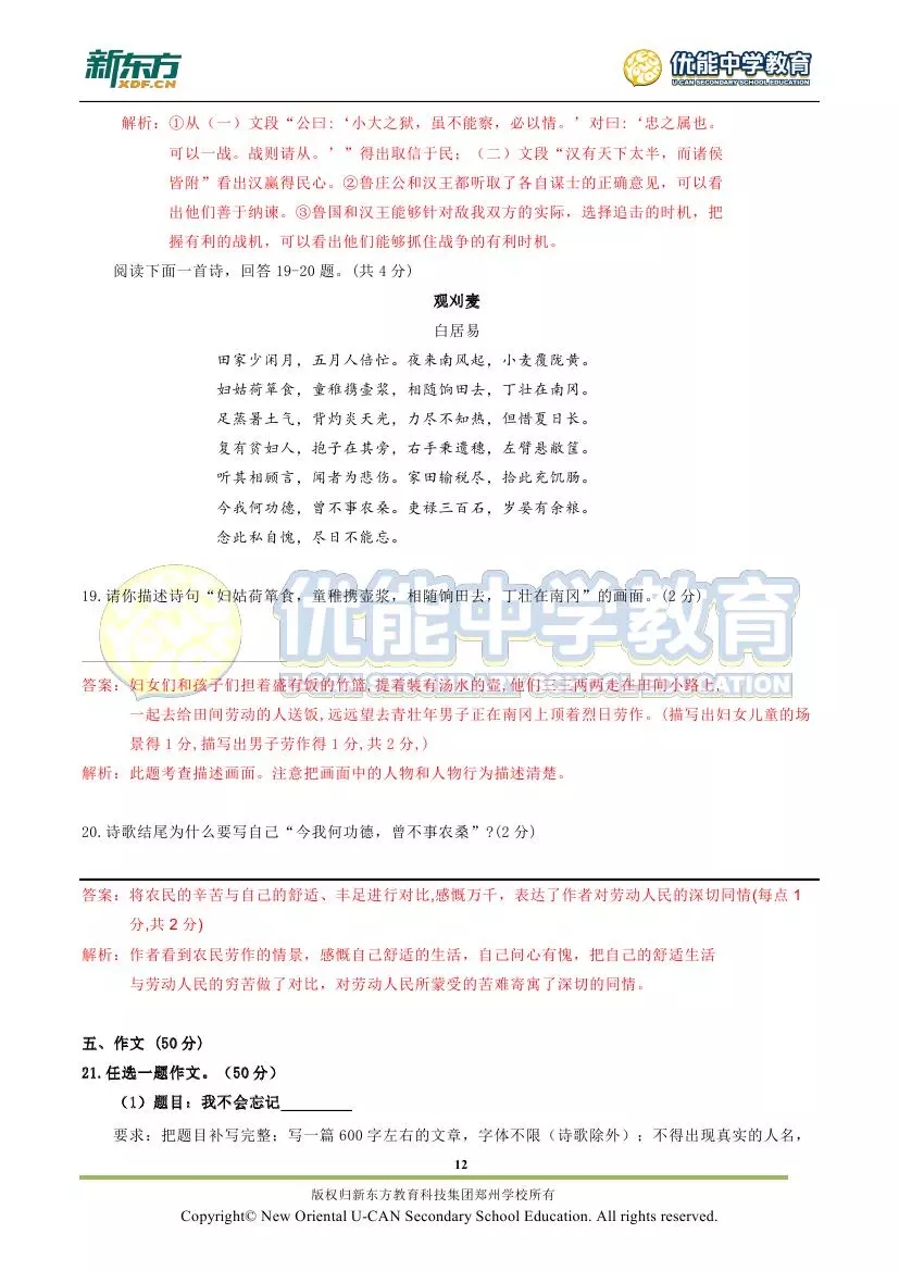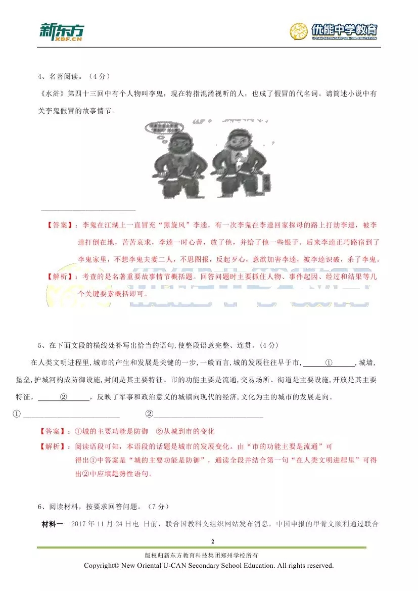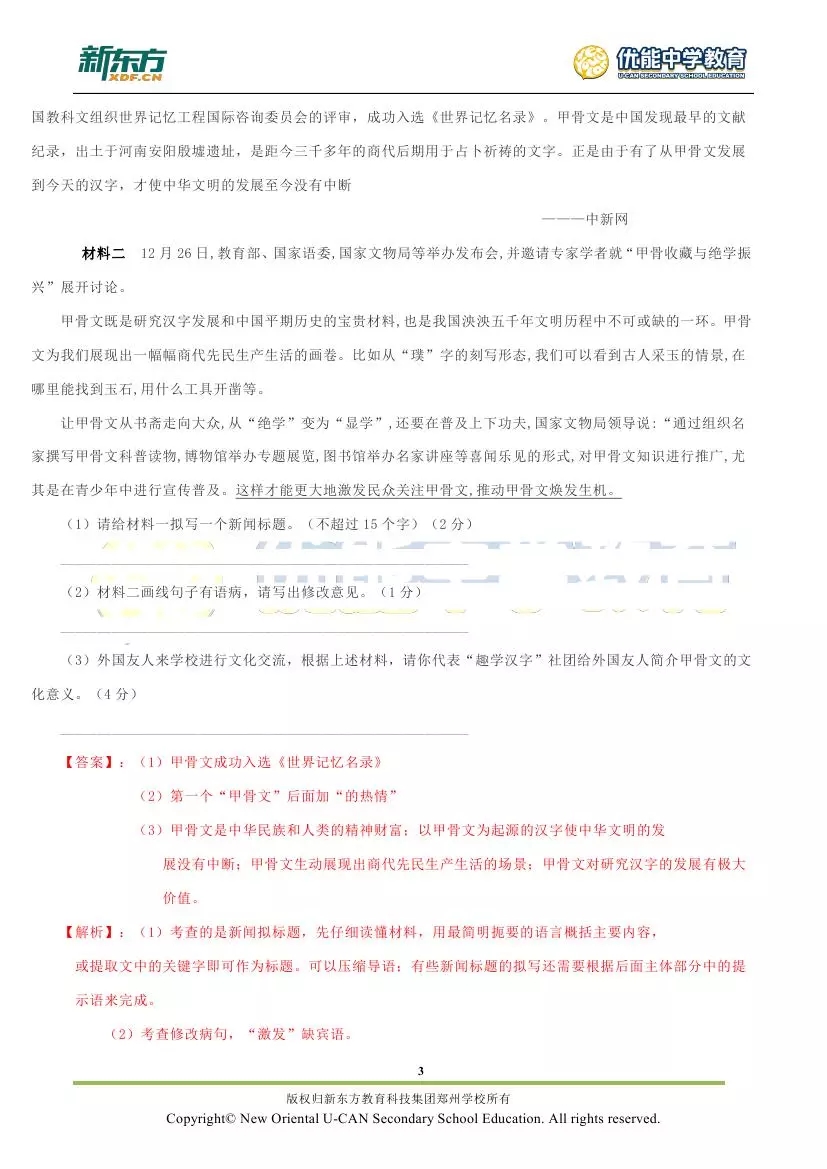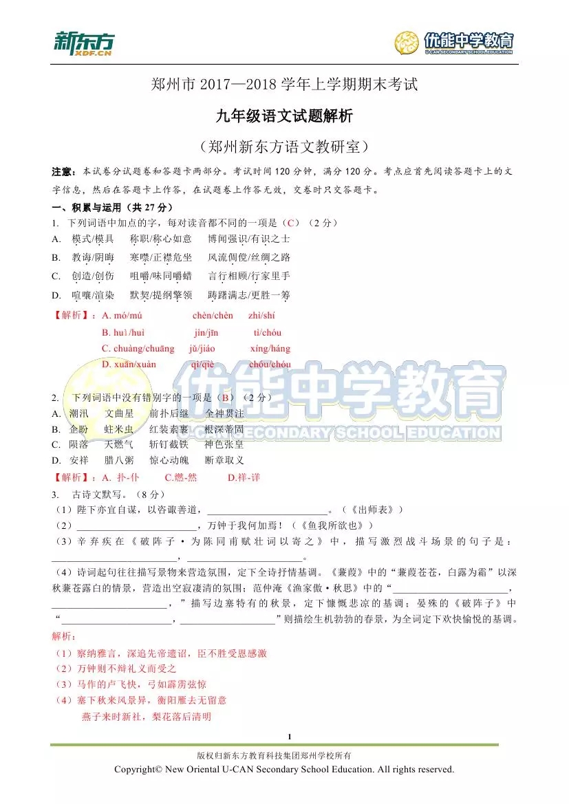 新东方郑州学校首发:2018郑州市九年级语文期末试卷解析!